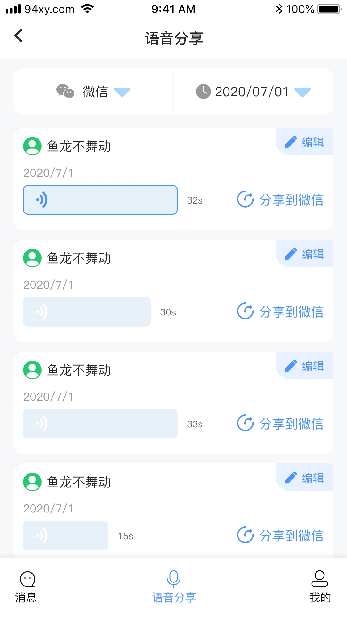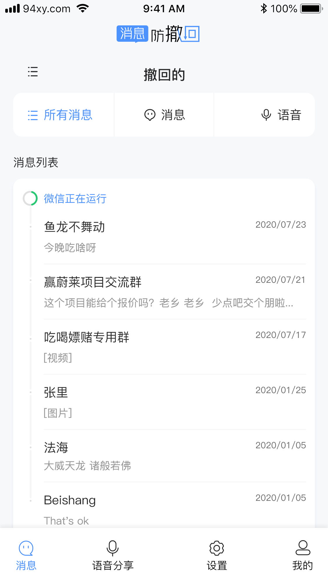 支持文本消息记录,语音,未来将支持图片和视频消息,支持导出,支持分享转发.